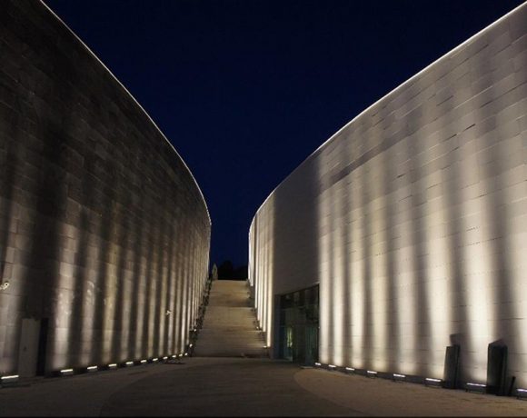 Müzenin dışı güney Fransa’dan gelen agregalardan yapılmış beyaz bir betonlar kaplanmış. Plaza kısmında çim ve alanın doğal bitki örtüsüyle Portekiz’den gelen kaldırım tasşları kullanılmış. Çevrenin peyzajı mimariye entegre edilmiş. İçeriye baktığımızda ise ilk dikkat çeken öge camlar. Yapının camları, birkaç katmanlı yalıtılmış cam. İçerideki görsel konforu sağlayan ve gelen ışığı da kontrol edebilecek bir özellik olarak da asitle aşındırılmış cam kullanılıyor. Görsel bir dinamiklik de katıyor binaya. İçeride ana mekanlar beyaz alçıyla kaplı. Ahşap döşeme kaplamaları da müzeye birtakım döşeme altı servis sistemleri için verimli bir yer sağlıyor.